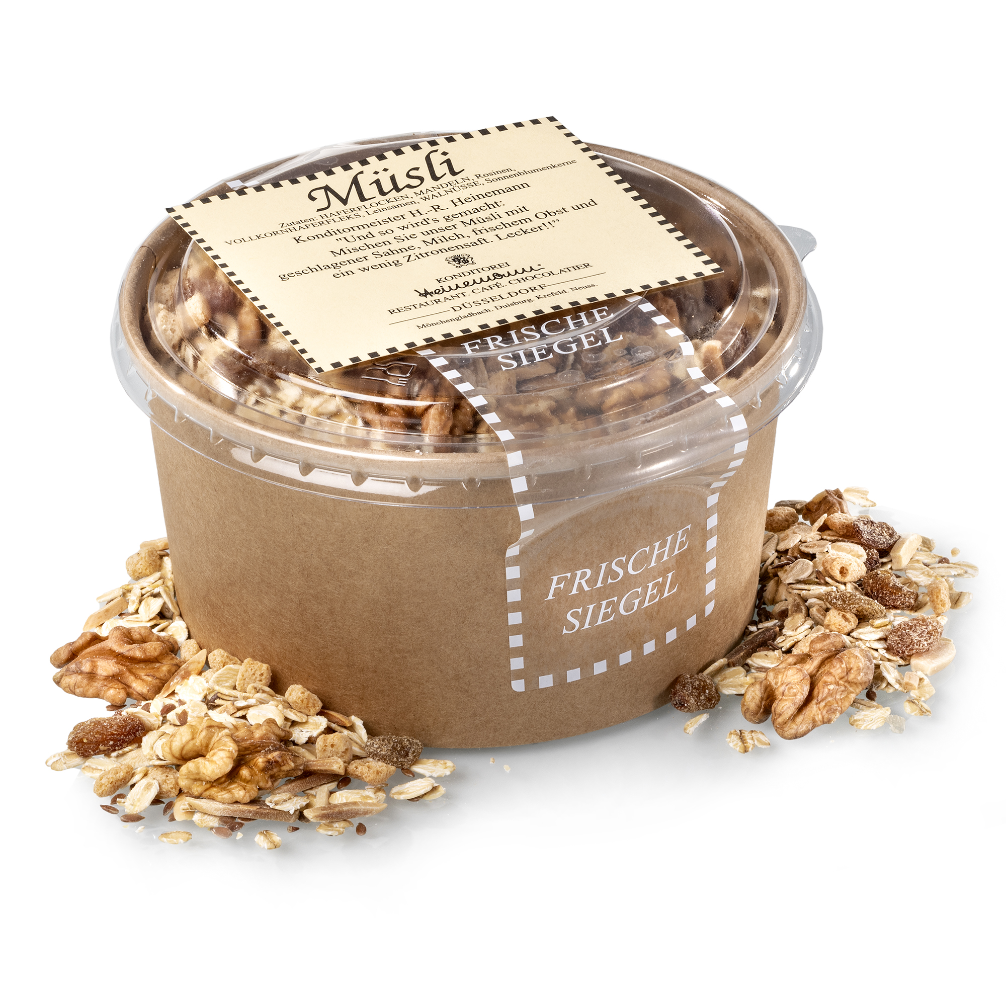 Konditormeister H.-R. Heinemann: Und so wird's gemacht: Mischen Sie unser Müsli mit geschlagener Sahne, Milch, frischem Obst und ein wenig Zitronensaft. Lecker!!