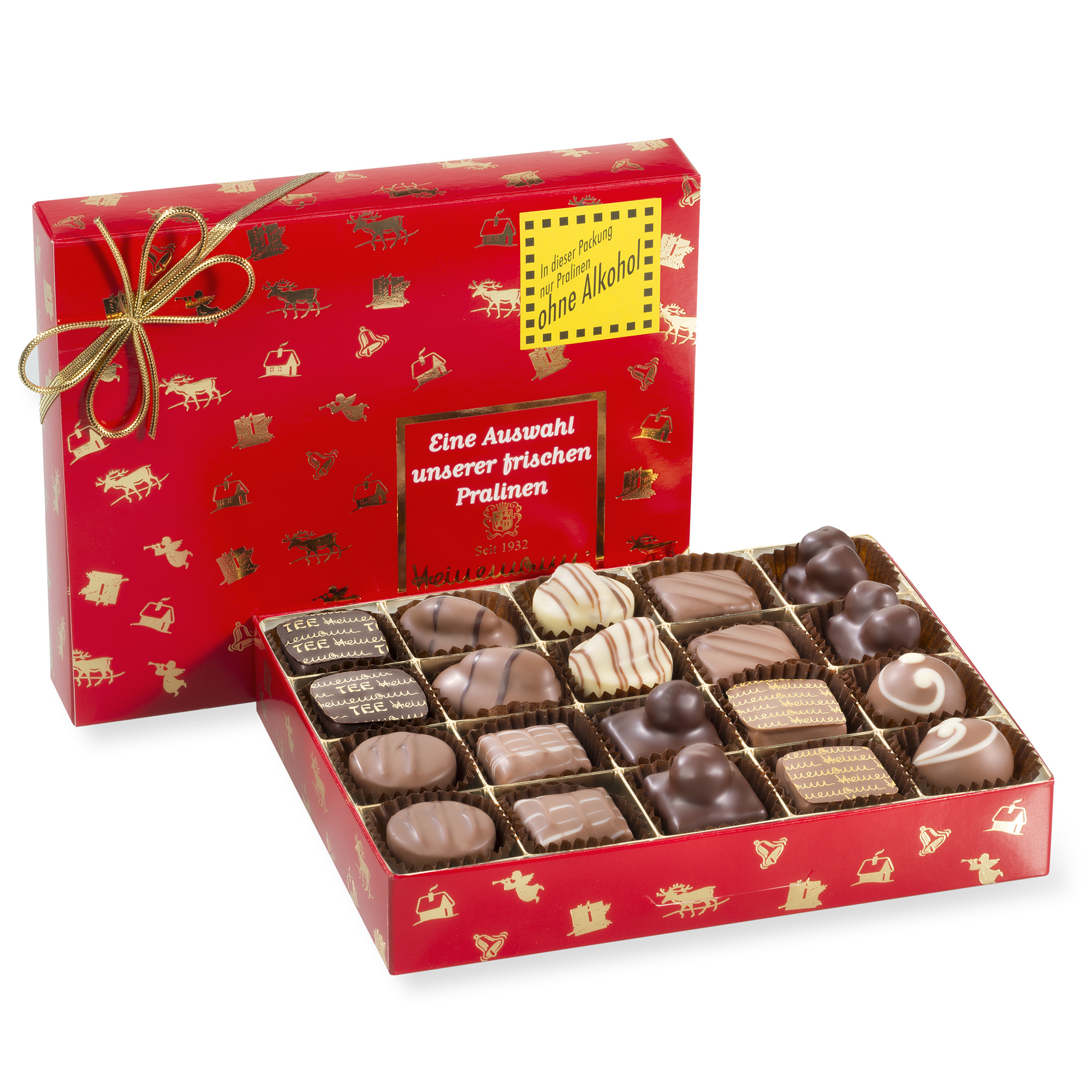 Zucker, HASELNÜSSE, MANDELN, Kakaobutter, SAHNE, VOLLMILCHPULVER, Edelkakao, BUTTER, Sonnenblumenöl teilweise gehärtet, Kokosfett, WALNÜSSE, Orangen, Emulgator: SOJALECITHIN, WEIZENMEHL, Glukosesirup, Feuchthaltemittel: Sorbitsirup, Vanilleextrakt
